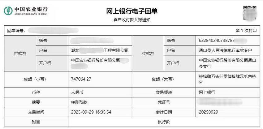 在确认被冻结工程款已具备结算条件后,法官敏锐把握时机,立即向第三方送达执行裁定书及协助执行通知书,并现场进行释法说理。在法院的督促下,第三方当日就将70余万元案款一次性汇入了法院账户。执行法官随即启动案款发还程序,将款项全额发放至朱某账户。